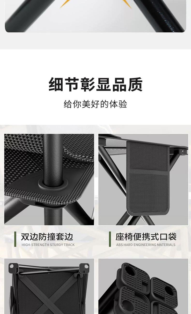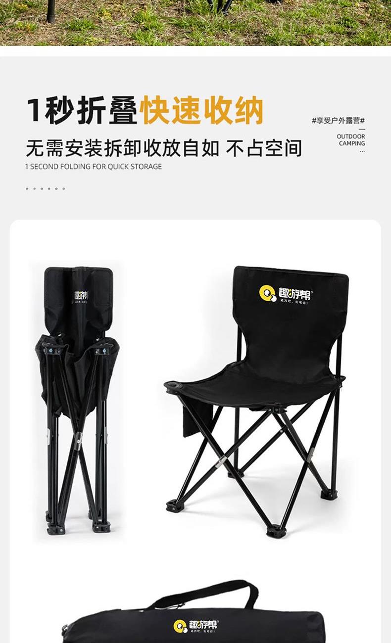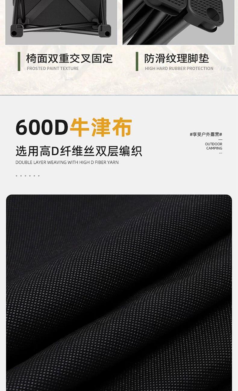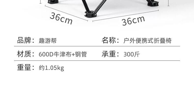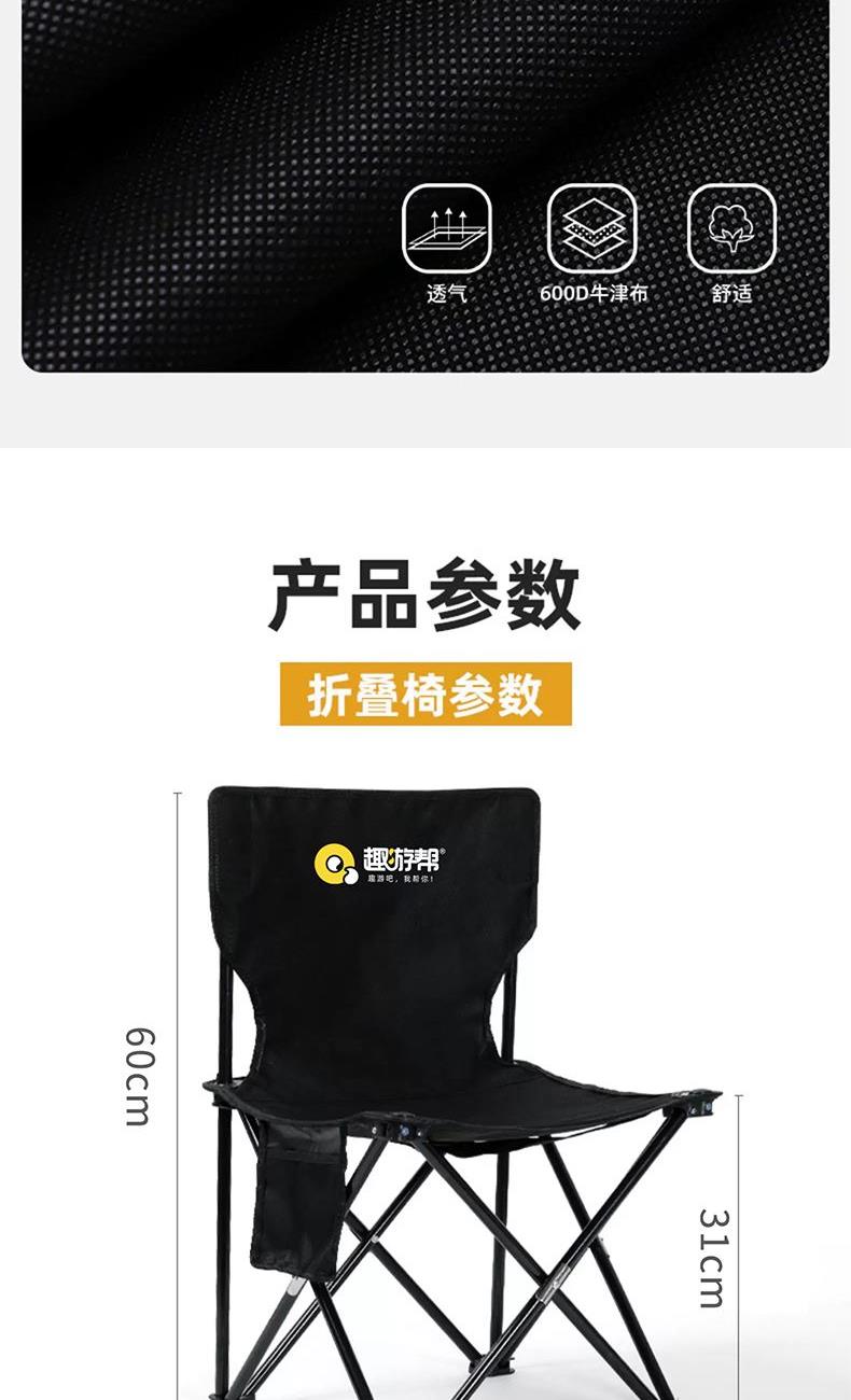 材质 钢管支架+600D牛津布 颜色 黑色 尺寸 展开:36*36*60cm 收纳:15*15*60cm 重量 1.0kg 配件 收纳袋*1 强化钢管支架,结实耐用 椅背加固塑料件 底部加固织带,加强承重 椅子带收纳袋设计,可放小物件,使用方便, 折叠收纳设计,不占空间,一袋装即走