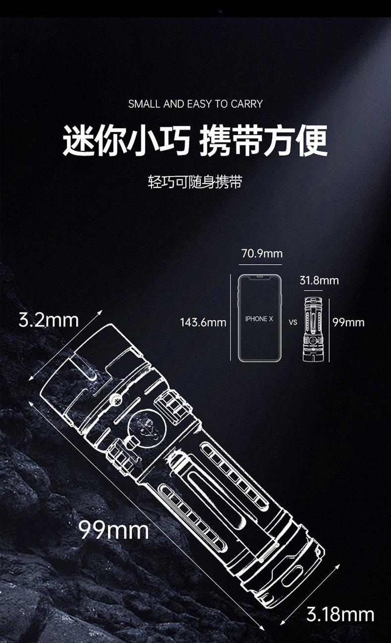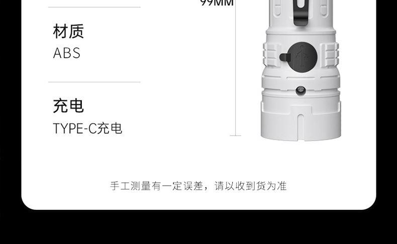 材质 ABS材质 LED灯珠 颜色 白色 尺寸 Φ32*99mm 包装尺寸:40*35*100mm 重量 38g 电池 3.7V/400MAH锂电池,TYPE-C 配件 数据线、包装盒 高亮、低亮、爆闪三挡调节 14500锂电池,TYPE-C接口充电 3PCS LED耐用灯珠照明, 迷你轻巧便携,携带方便,