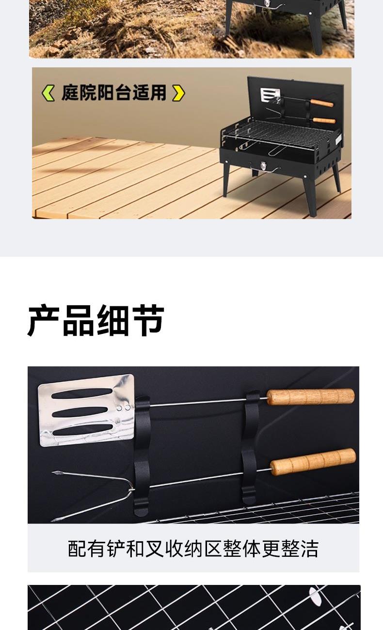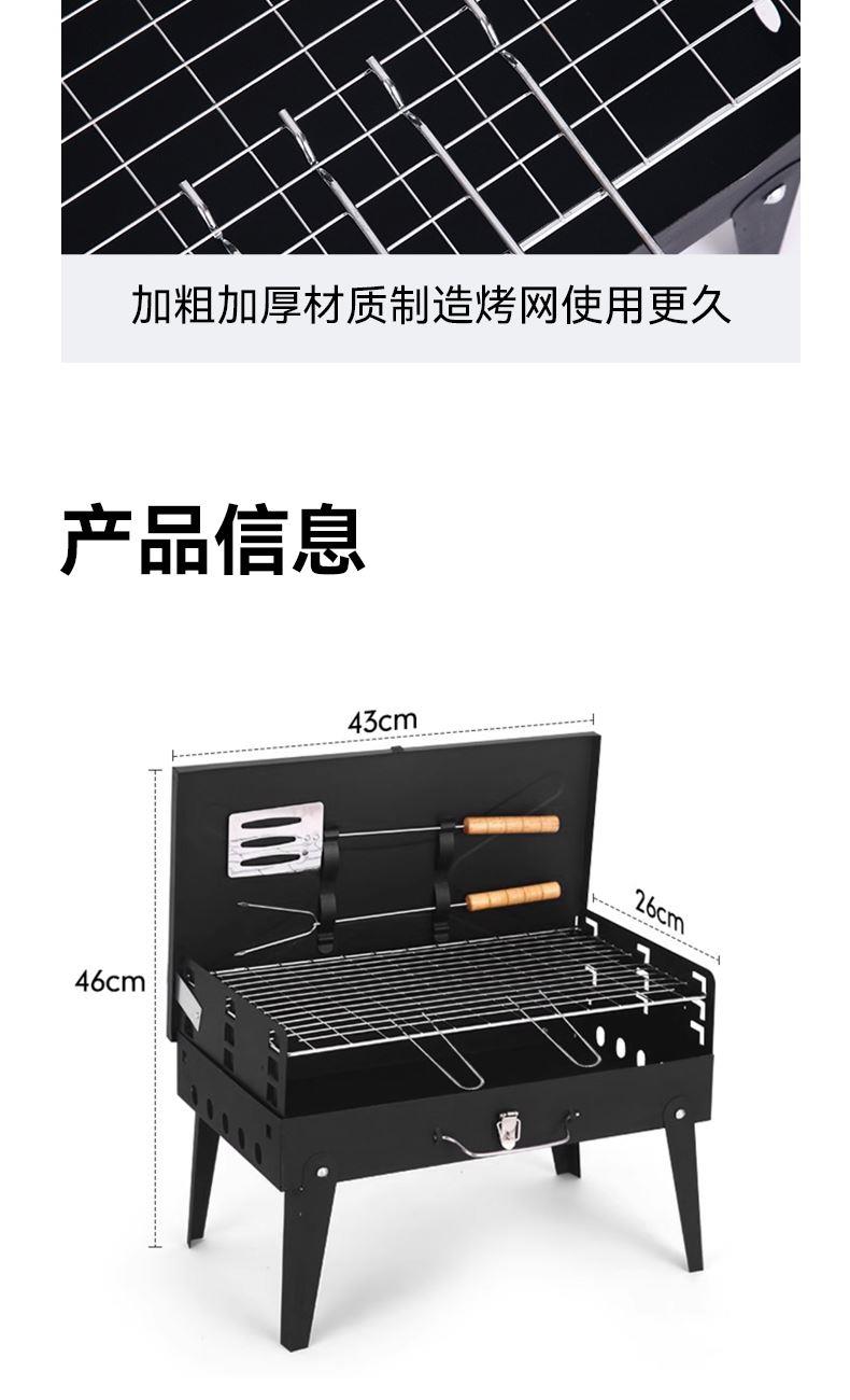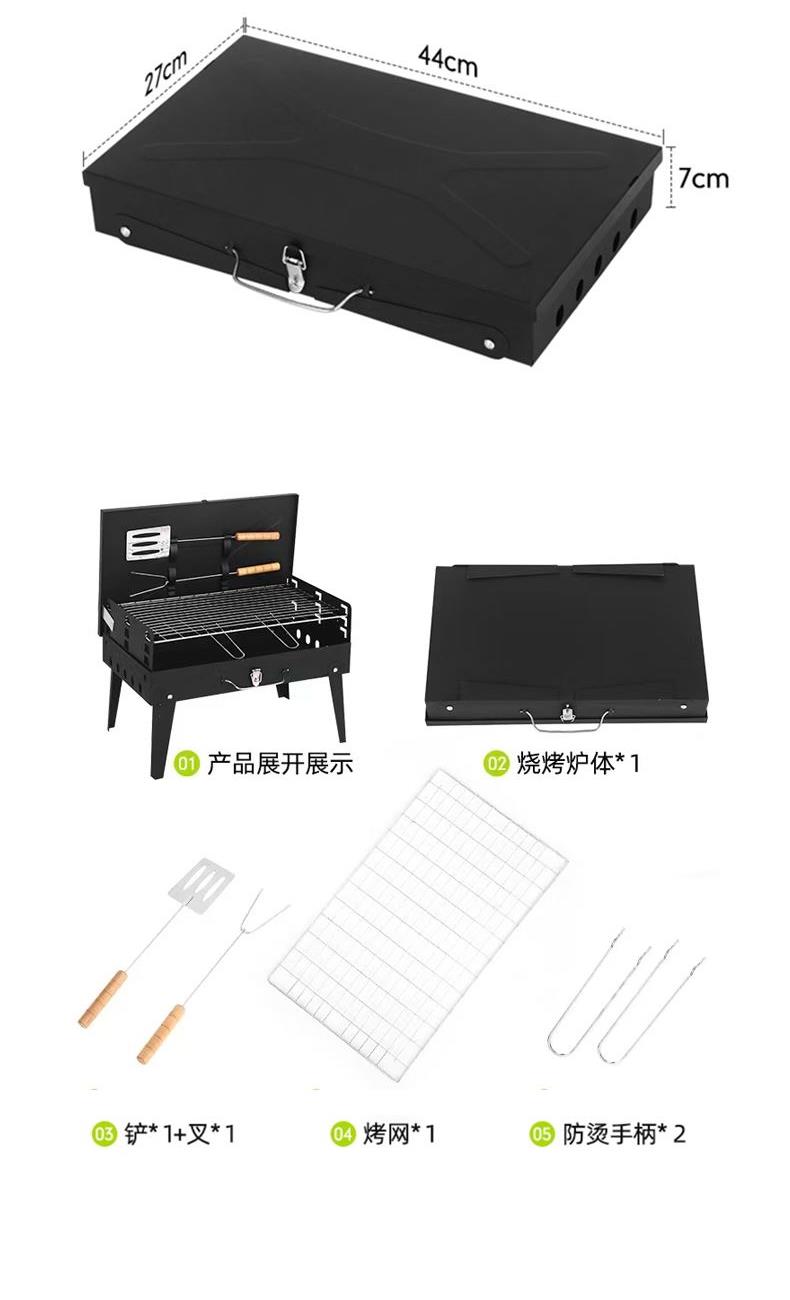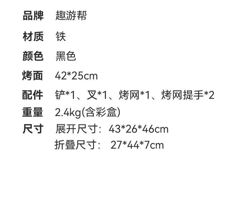 材质 铁 颜色 黑色 尺寸 43*26*46cm 烤面 42*25cm 重量 2.4kg(含彩盒) 一体式开合收纳折叠便携烤炉 两侧通风口设计火力燃烧更旺盛 一体收纳可拎式箱包设计 三面挡风板设计,保证碳火稳定