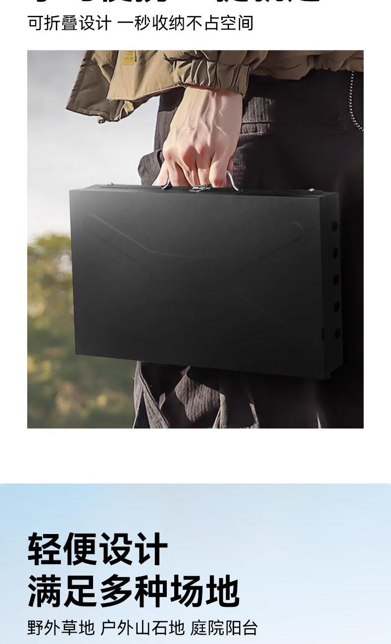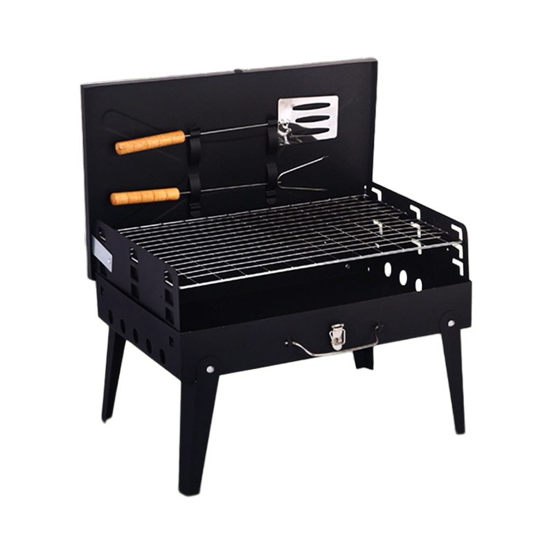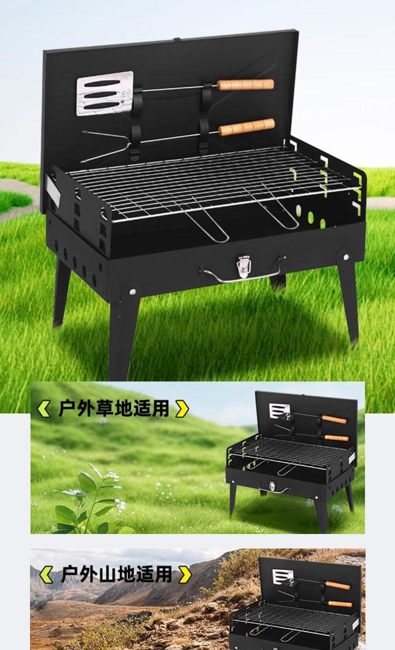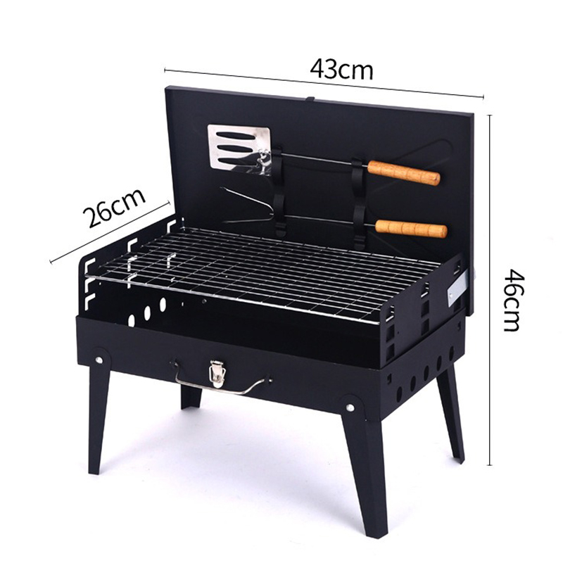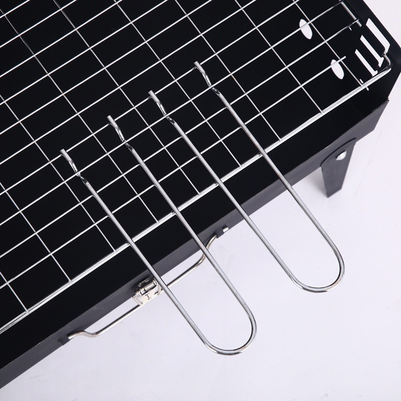 材质 铁 颜色 黑色 尺寸 43*26*46cm 烤面 42*25cm 重量 2.4kg(含彩盒) 一体式开合收纳折叠便携烤炉 两侧通风口设计火力燃烧更旺盛 一体收纳可拎式箱包设计 三面挡风板设计,保证碳火稳定