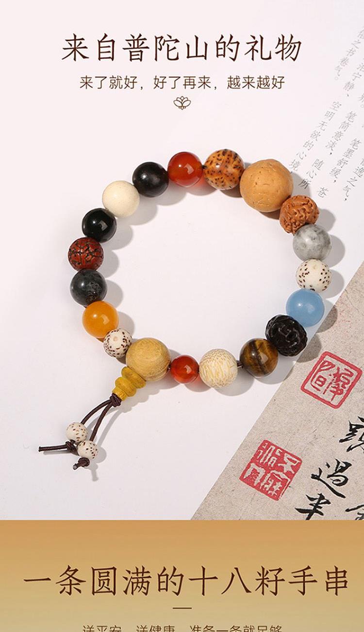 辟邪护身,诸事吉祥: 作为在寺庙中经佛法加持的圣物,寓意十八籽具有强大的护身辟邪功效,能保佑佩戴者平安健康,远离灾祸,所求皆如愿。 静心定志,烦恼消散: 盘玩手串的过程本身就是一种禅修,有助于安抚焦虑情绪,让内心回归平静,专注当下,戒除焦躁。佩戴十八籽,寓意着约束六根、远离六尘、清净六识,从而达到身心清净、解脱烦恼的境界。它提醒修行者要看清世界的本质,不执着于表象。